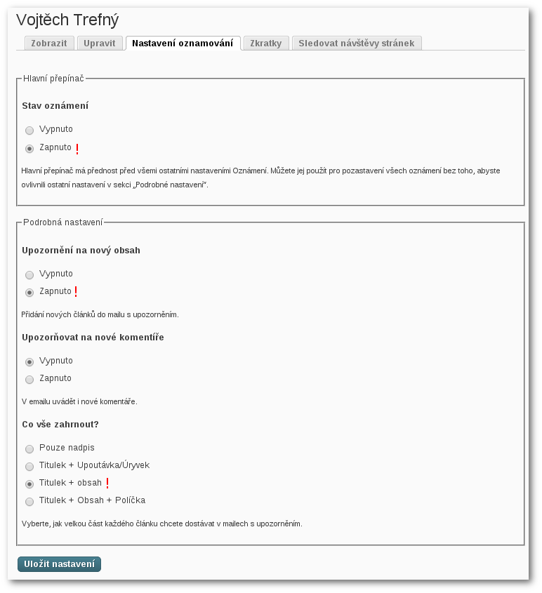 Pokud chcete být upozorňováni o aktualitách bez toho, abyste museli pravidelně navštěvovat tyto stránky, můžete si nastavit, aby všechny nové články byly posílány na váš mail. Pro nastavení upozorňování na novinky mailem přejděte do nastavení svého účtu a zde přejděte na kartu Nastavení oznamování.
